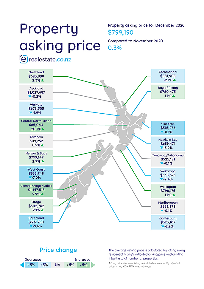 The asking price for properties around New Zealand was $799,190 at the close of 2020, compared to $703,780 in December 2019.