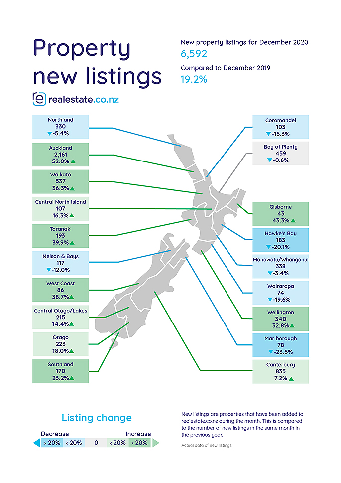 Auckland saw the most significant increase in new listings last month, with 52.0 per cent more new listings compared to December 2019, while Marlborough saw the biggest decrease with 23.5 per cent fewer properties coming onto the market.